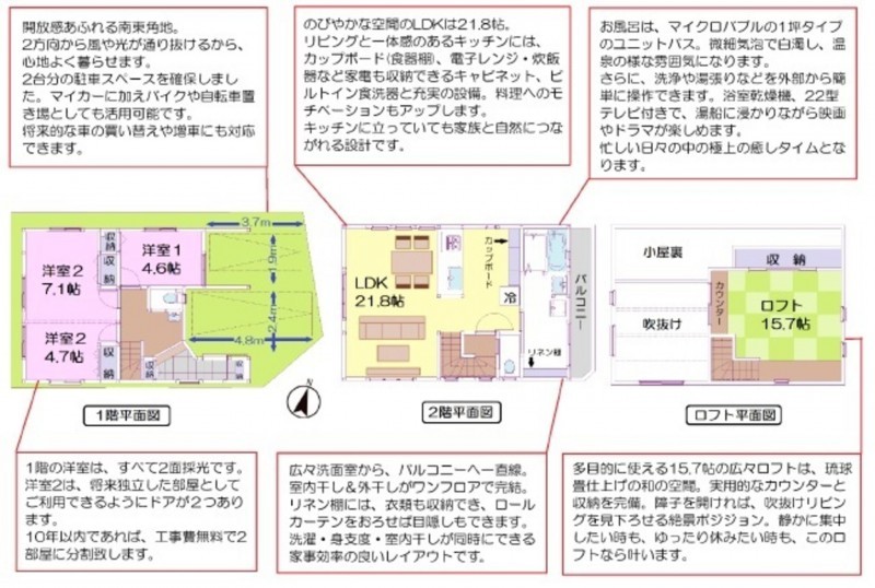 - システムキッチン、カウンターキッチン、洗浄便座、浴室乾燥機、追い焚き、複層ガラス、駐車場2台分